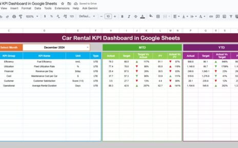 It helps users view Month-To-Date (MTD) and Year-To-Date (YTD) metrics, compare Actual vs Target, and analyze trends over time. With conditional formatting, traffic lights, and arrows, the dashboard instantly highlights areas that are improving or need attention.