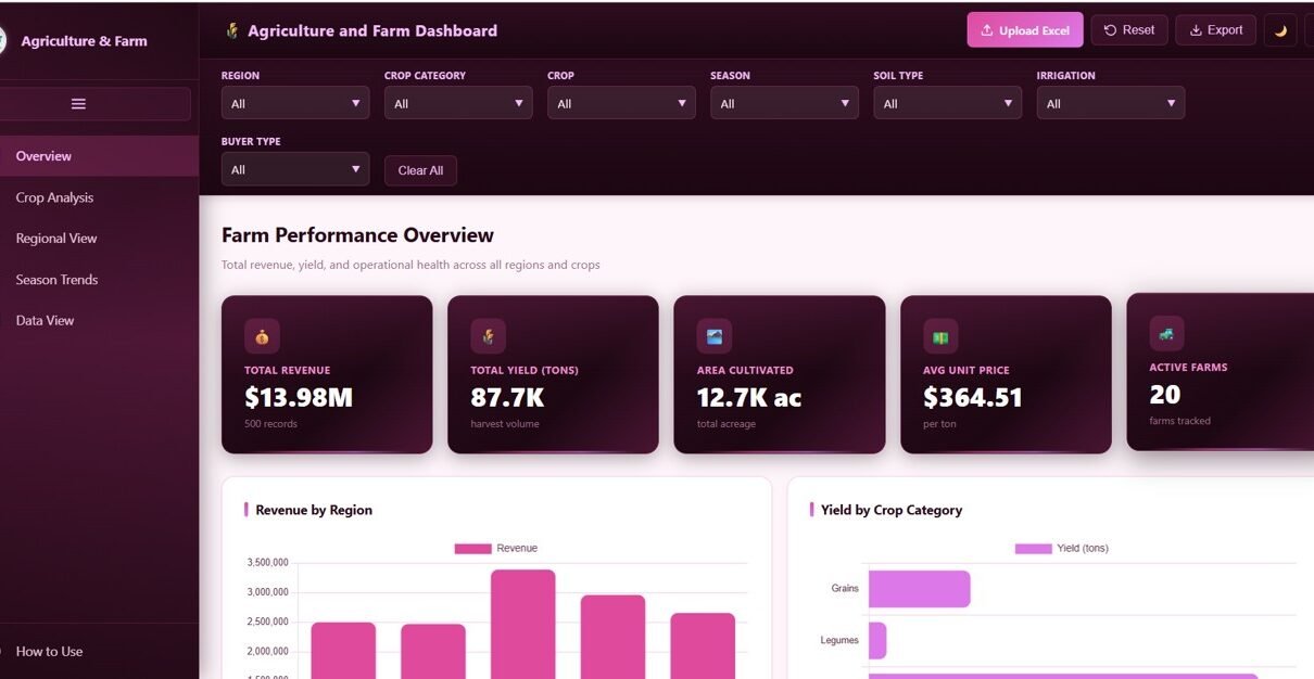 Overview Page of the Agriculture and Farm DashboardThe Overview page serves as the central command center of the Agriculture and Farm Dashboard. At the top of the page, five KPI cards display Total Revenue, Total Yield Tons, Area Cultivated, Avg Unit Price, and Active Farms, giving users an instant snapshot of their entire farming operation. Below the KPI cards, the page features five powerful visuals that break down the data from different angles. Revenue by Region shows how income is distributed across geographic areas, helping managers identify which regions contribute the most to the bottom line. Yield by Crop Category reveals the total production volume grouped by crop type, making it easy to spot which categories dominate the harvest. Revenue Distribution by Season highlights how earnings shift across planting and harvesting cycles throughout the year. Top 8 Crops by Revenue ranks the highest-earning crops, allowing decision-makers to focus resources on the most profitable products. Finally, the Monthly Revenue Trend visualizes income patterns over time so users can identify growth periods, seasonal dips, and long-term financial trajectories.Agriculture and Farm Dashboard in HTML