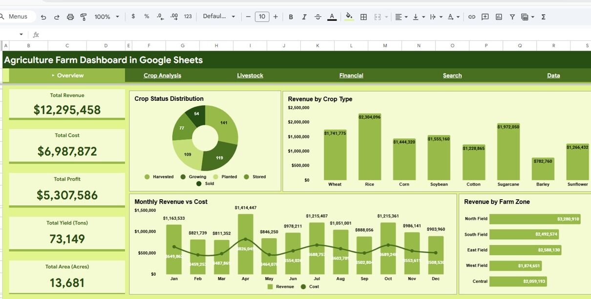 Agriculture Farm Dashboard in Google Sheets is a comprehensive, interactive analytical tool designed for farmers, agronomists, and agricultural business managers who want to track farm revenue, crop yield, operating costs, profit margins, and livestock performance in one centralized Google Sheets dashboard. Managing a modern farm involves monitoring dozens of metrics across crops, livestock, seasons, and zones. Instead of juggling scattered spreadsheets, this Google Sheets dashboard template brings all your critical agricultural data together in beautifully designed interactive pages that update dynamically with your data.