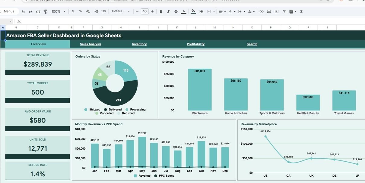 Amazon FBA Seller Dashboard in Google Sheets is a powerful, ready-to-use analytics template designed specifically for Amazon FBA sellers who want to track revenue, orders, profitability, PPC advertising spend, inventory costs, and marketplace performance — all from one centralized Google Sheets workbook. This comprehensive dashboard includes 6 sheet tabs covering 4 interactive dashboard pages (Overview, Sales Analysis, Inventory, and Profitability), a Search Page for instant order lookups, and a Data Sheet where you enter your raw FBA order data.