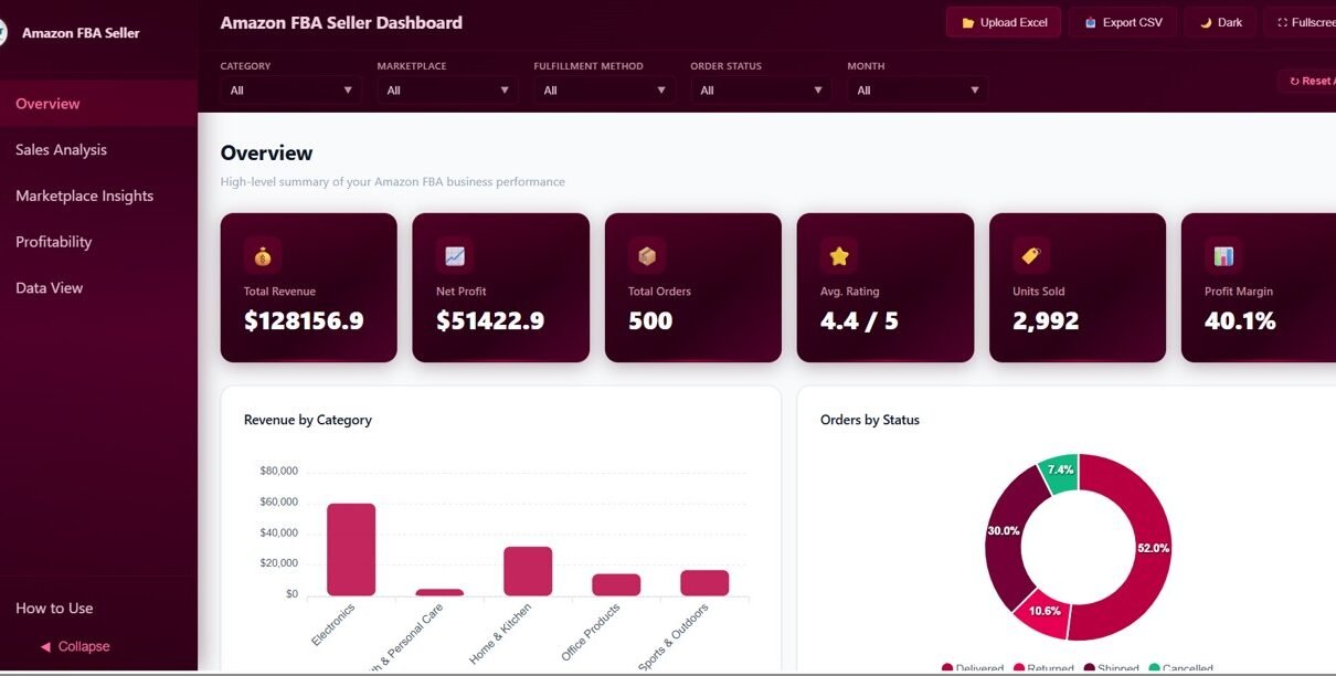 • 12+ Charts and Visualizations — covering revenue trends, category analysis, marketplace comparisons, fulfillment breakdowns, and profitability