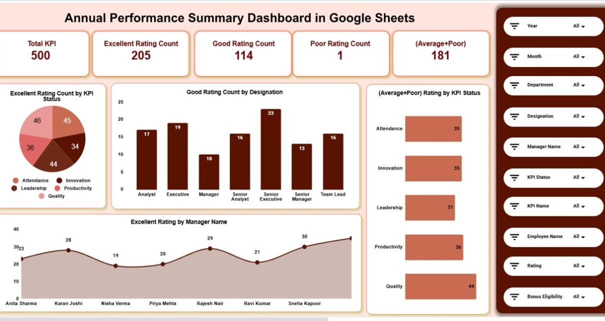 An Annual Performance Summary Dashboard is a centralized reporting tool that consolidates KPI ratings and performance outcomes for the entire year. Instead of reviewing individual appraisal sheets, decision-makers can instantly see performance distribution across departments, designations, managers, and months.Annual Performance Summary Dashboard in Google Sheets