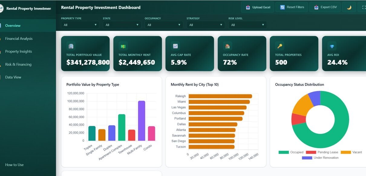 Rental Property Investment Dashboard in HTML with 5 interactive pages for portfolio overview, financial analysis, property insights, risk and financing, and data view. Track Total Portfolio Value, Monthly Rent, Cap Rate, Occupancy, ROI, and more.