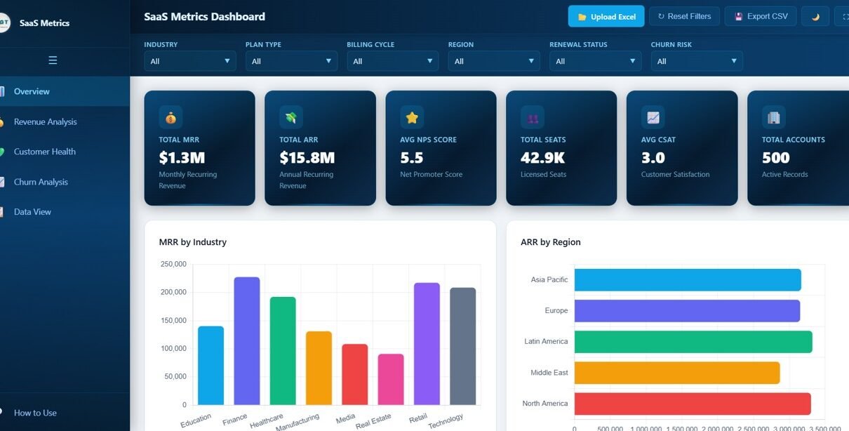 SaaS Metrics Dashboard in HTML with 5 interactive pages tracking MRR, ARR, NPS, CSAT, churn risk, and renewal status. Browser-based, zero installation required.
