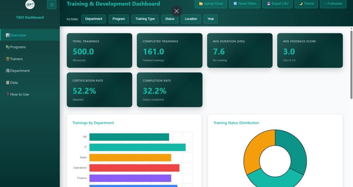 Training and Development Dashboard in HTML is an interactive browser-based analytics template with 5 dashboard pages, 6 KPI cards, and 15+ charts for tracking training programs, trainer performance, and certifications.