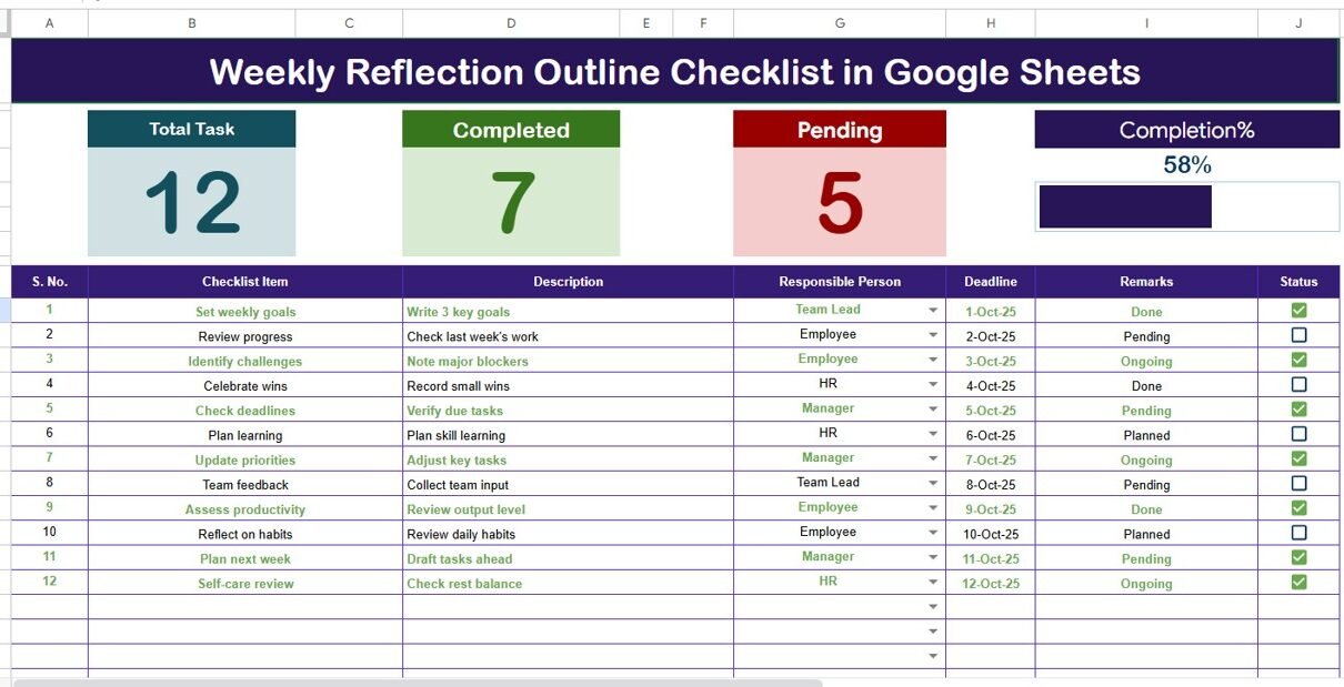 Weekly Reflection Outline Checklist in Google Sheets