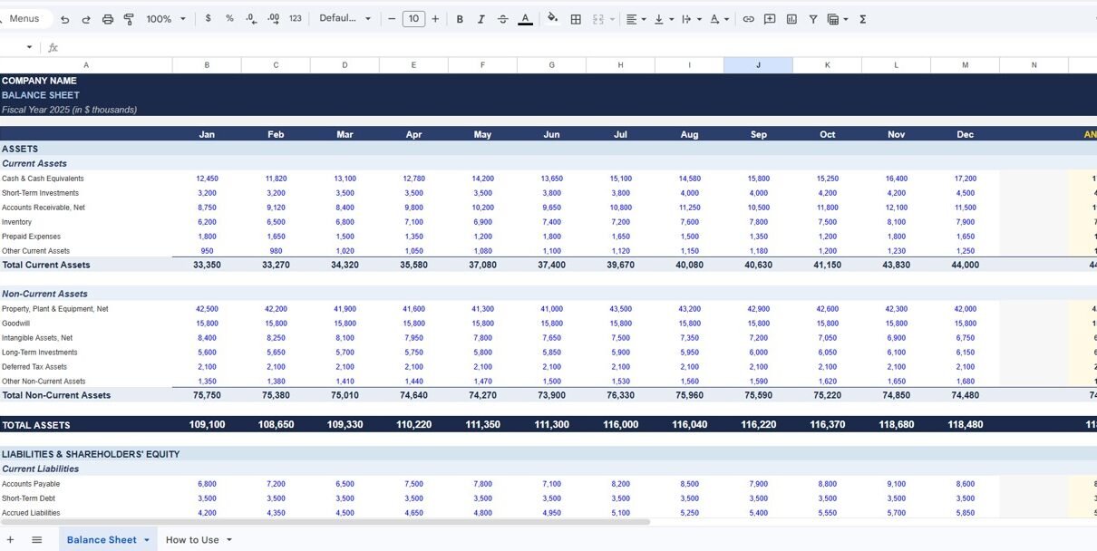 The Balance Sheet Template in Google Sheets provides a simple and powerful solution. It helps businesses organize financial data, track monthly balances, and automatically calculate totals. Therefore, business owners, accountants, and finance managers can analyze financial performance quickly.