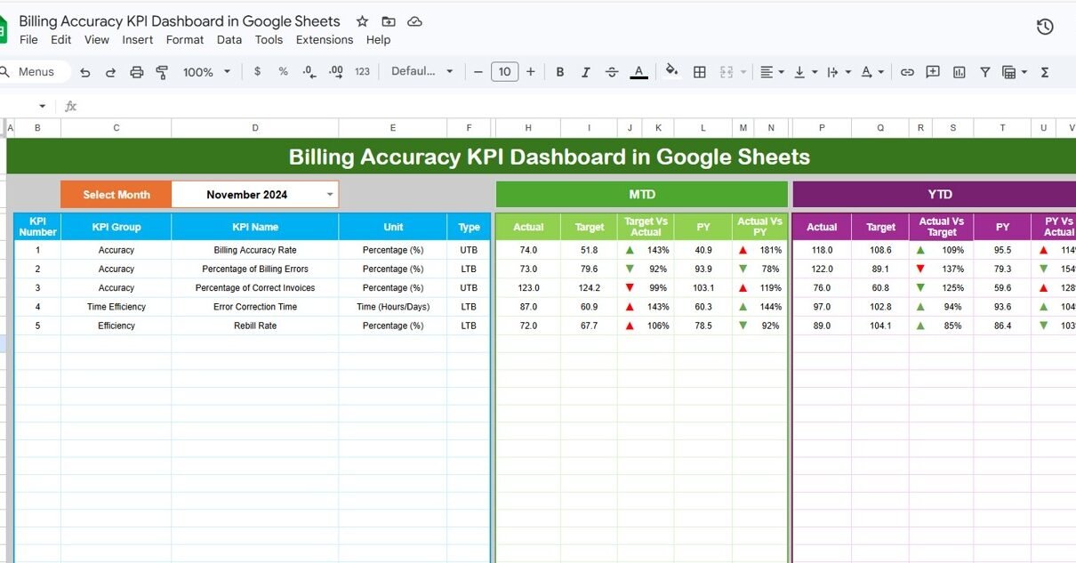 This is the main performance view of the Billing Accuracy KPI Dashboard in Google Sheets. On cell D3, select any month from the dropdown and the entire dashboard refreshes with updated numbers. For each KPI, you see MTD Actual, Target, Previous Year data along with Target vs Actual and PY vs Actual percentages. Conditional formatting arrows instantly show whether each billing metric is on track or needs attention. The same structure repeats for YTD metrics, giving you both monthly and cumulative performance visibility.