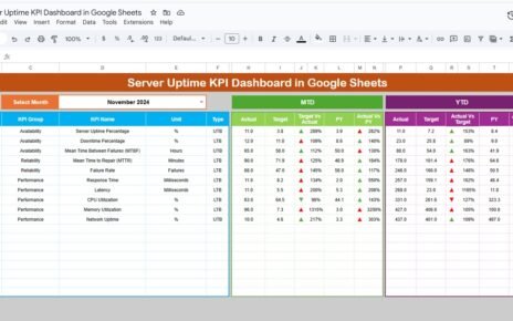 - Color-coded visual indicators via conditional formatting to quickly identify KPI status.
