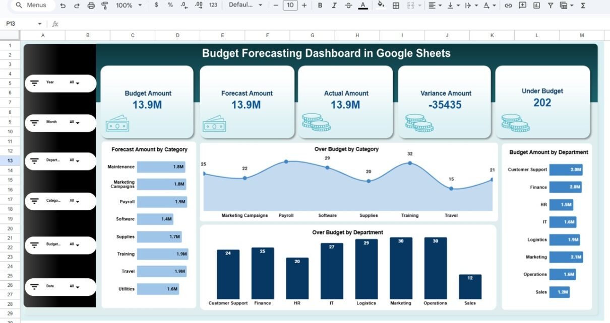 In this article, we explain how the dashboard works, its structure, charts, benefits, best practices, and FAQs.Budget Forecasting Dashboard in Google Sheets