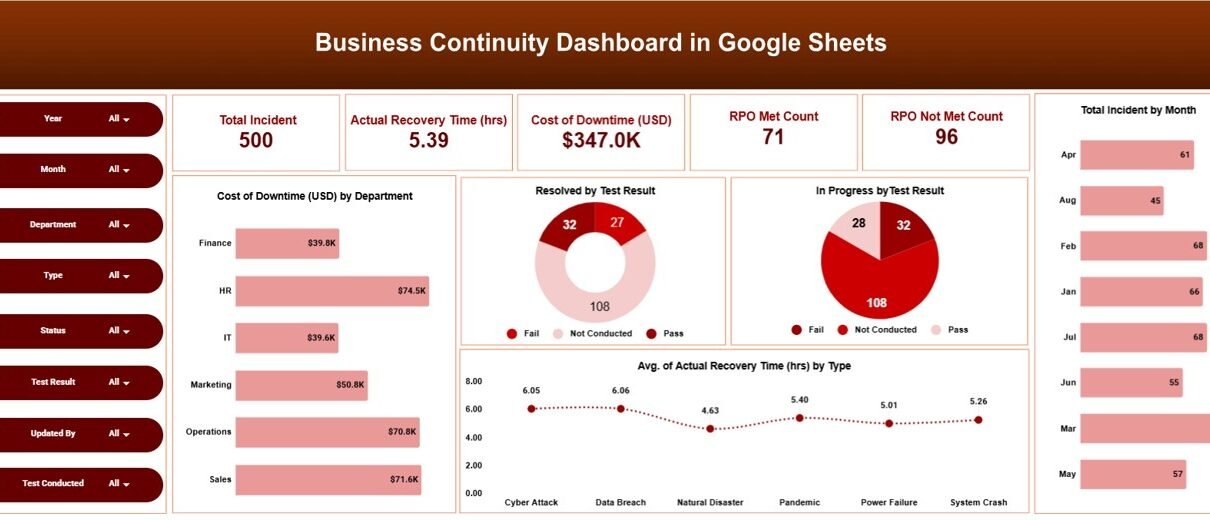 A Business Continuity Dashboard in Google Sheets provides a clear, structured, and actionable view of organizational resilience. It helps teams track incidents, manage recovery time, control downtime costs, and improve testing outcomes. Because it is simple, collaborative, and visual, it becomes a powerful tool for strengthening business continuity planning.