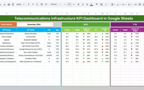 The Dashboard Sheet Tab is the heart of the system. This is where all KPIs appear in a clean and visually rich layout.