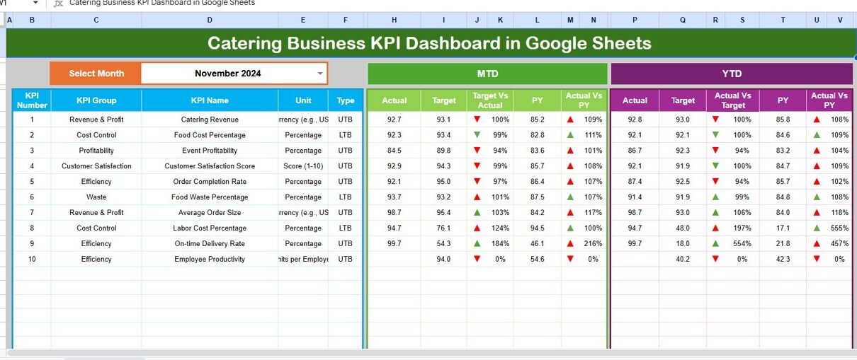 Enter last year’s data in this sheet. The dashboard then compares Actual vs PY performance, using conditional formatting to highlight positive or negative changes.Catering Business KPI Dashboard in Google Sheets