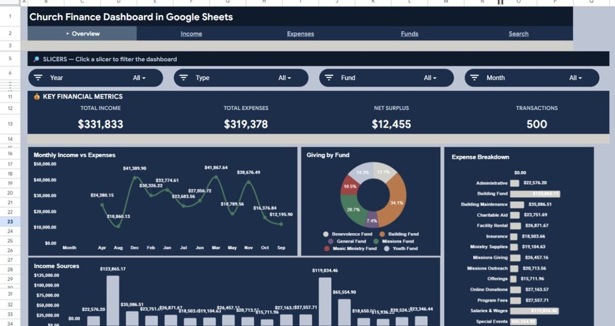 Church Finance Dashboard in Google Sheets - OverviewChurch Finance Dashboard in Google Sheets