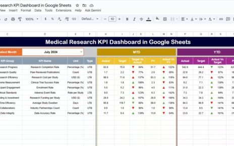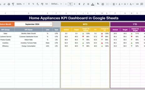 It helps users view Month-To-Date (MTD) and Year-To-Date (YTD) metrics, compare Actual vs Target, and analyze trends over time. With conditional formatting, traffic lights, and arrows, the dashboard instantly highlights areas that are improving or need attention.