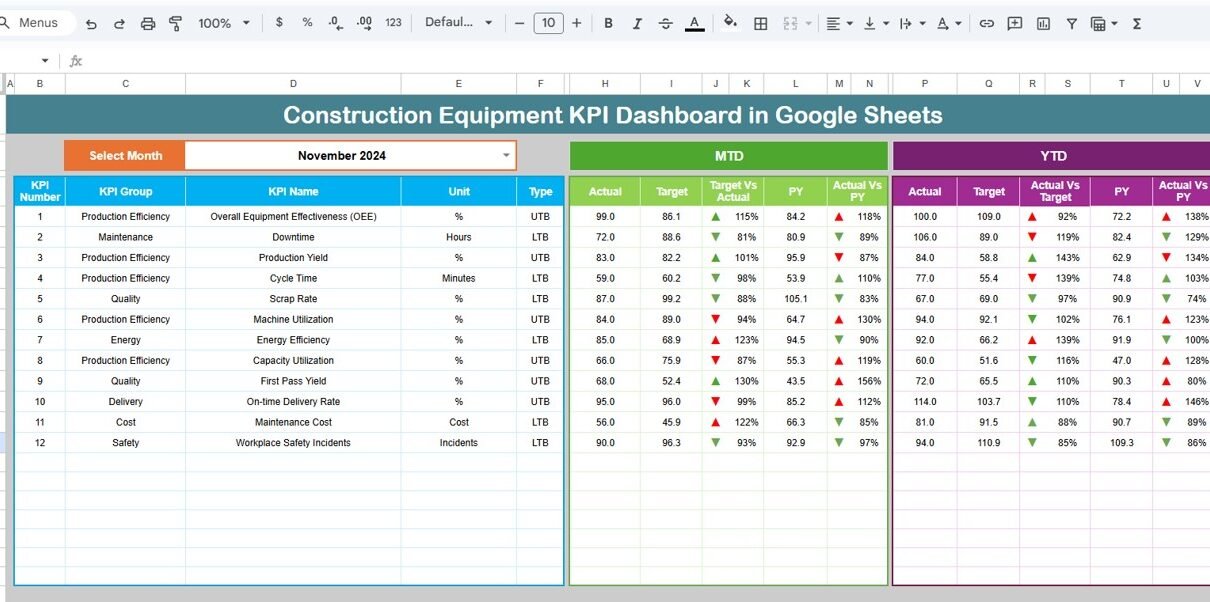 A Construction Equipment KPI Dashboard in Google Sheets is a powerful and practical solution for tracking equipment performance. It combines KPI definitions, actuals, targets, and historical data into one interactive dashboard.