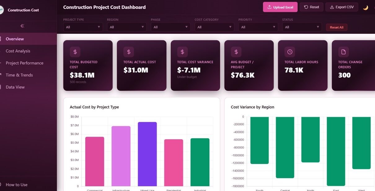 Construction Project Cost Dashboard in HTML is a browser-based interactive analytics template designed for construction project managers, contractors, cost engineers, and stakeholders who need to monitor project budgets, track actual costs, analyze cost variances, and evaluate project performance from a centralized dashboard. This HTML dashboard template includes 5 interactive pages covering cost overview, cost analysis, project performance, time and trends, and a detailed data view — all opening directly in any modern web browser with zero software installation required.Construction Project Cost Dashboard in HTML