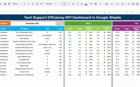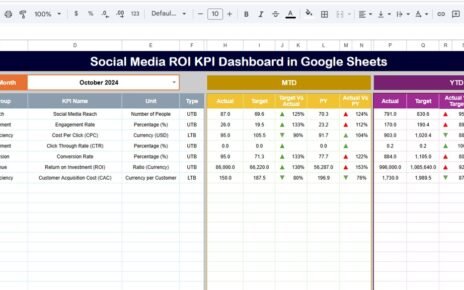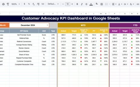 A CSR KPI Dashboard in Google Sheets consolidates all CSR metrics into a single interactive platform. It allows organizations to monitor Month-to-Date (MTD) and Year-to-Date (YTD) performance, compare current results with targets and previous years, and identify trends across different CSR initiatives.