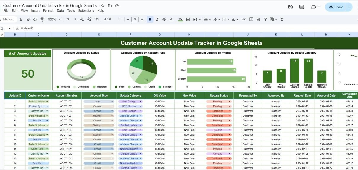 Customer account information changes frequently. Customers request updates for contact details, billing information, account preferences, service plans, and compliance-related records. However, when these requests are handled through emails, calls, or unstructured spreadsheets, teams face delays, data errors, and poor visibility.Customer Account Update Tracker in Google Sheets