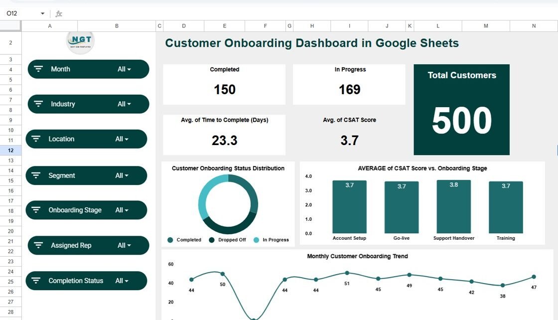 A Customer Onboarding Dashboard in Google Sheets provides a powerful yet simple solution. It helps teams track onboarding status, duration, customer satisfaction, and progress across industries, locations, and onboarding stages—all in one centralized dashboard.