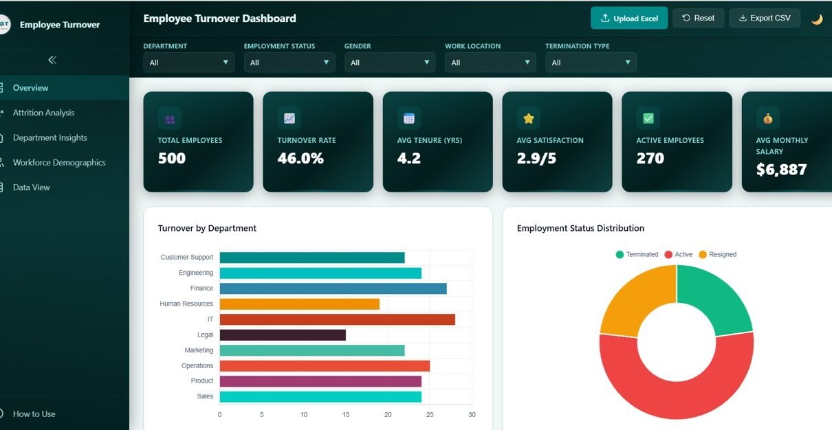 The Overview Page serves as the main landing page and provides a high-level summary of your organization’s workforce health. At the top, you will see 6 KPI cards displaying Total Employees, Turnover Rate, Avg Tenure (Yrs), Avg Satisfaction, Active Employees, and Avg Monthly Salary. These cards give you an immediate pulse check on your workforce.