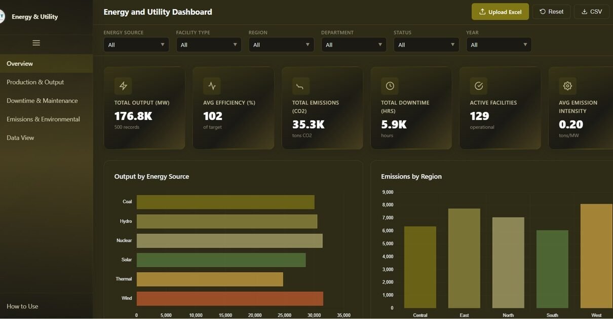 The Overview page serves as your command center for energy and utility operations. At the top, six high-level KPI cards display Total Output (MW), Avg Efficiency (%), Total Emissions (tons CO2), Total Downtime (hrs), Active Facilities, and Avg Emission Intensity. These cards provide an immediate snapshot of your entire energy portfolio’s health and performance status.