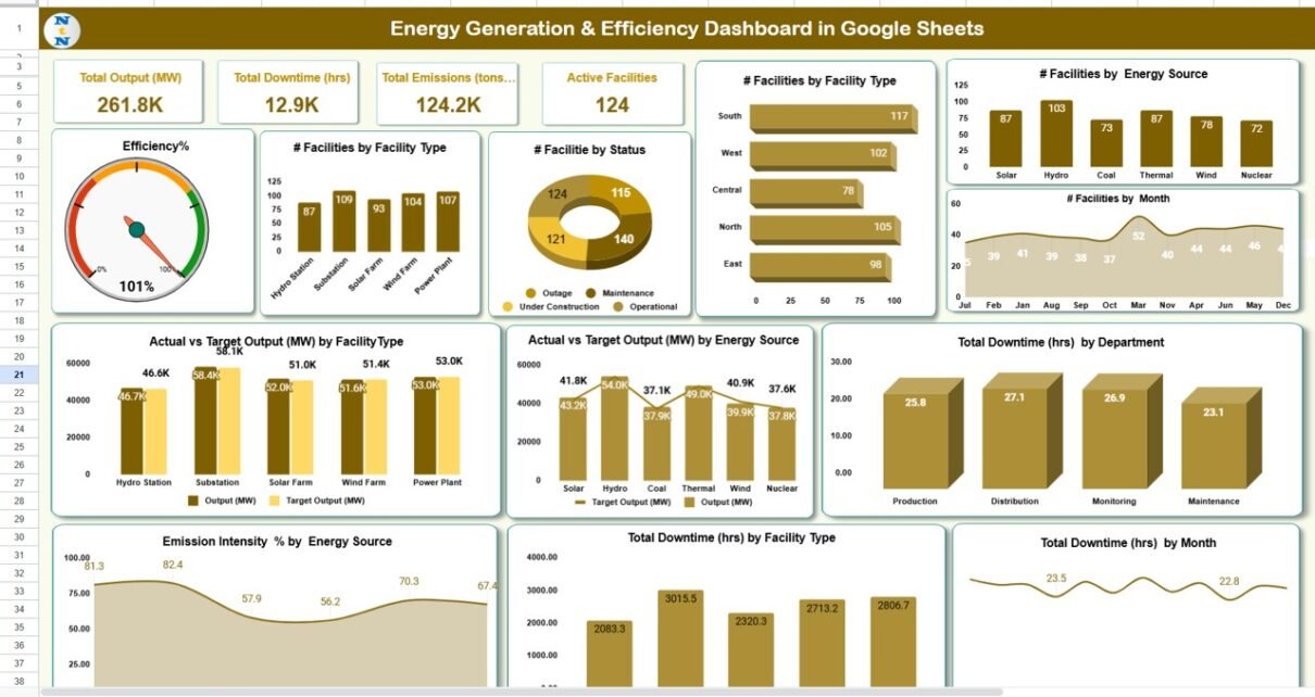 Efficient energy generation and resource management are essential for every utility provider and energy organization. The Energy Generation & Efficiency Dashboard in Google Sheets helps you monitor key metrics such as power output, facility status, emissions, and operational efficiency — all in one place.Energy Generation & Efficiency Dashboard in Google Sheets