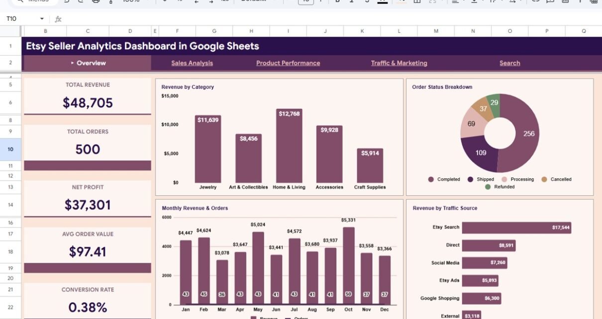 Etsy Seller Analytics Dashboard in Google Sheets is a powerful, ready-to-use analytics template designed specifically for Etsy shop owners, creative entrepreneurs, and e-commerce sellers who want to monitor revenue, orders, profits, product performance, traffic sources, and marketing effectiveness from one centralized Google Sheets workbook. Whether you manage a thriving handmade jewelry store, a vintage clothing boutique, or a digital download shop on Etsy, this dashboard provides actionable insights that help you grow your business faster.