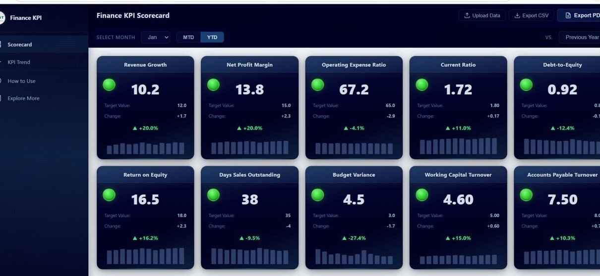 A Finance KPI Scorecard in HTML is a browser-based interactive dashboard that tracks critical financial performance indicators with traffic light color coding, sparkline trends, and comparison charts. It is designed for CFOs, finance managers, controllers, business analysts, and accounting teams who need a lightweight, installation-free tool to monitor financial health and present performance data to stakeholders.