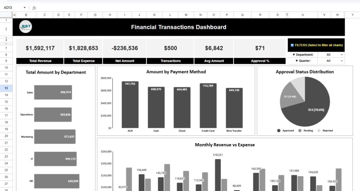 As a result, finance managers may find it difficult to track revenue trends, analyze departmental expenses, monitor approvals, and identify financial patterns.Financial Transactions Dashboard in Google Sheets