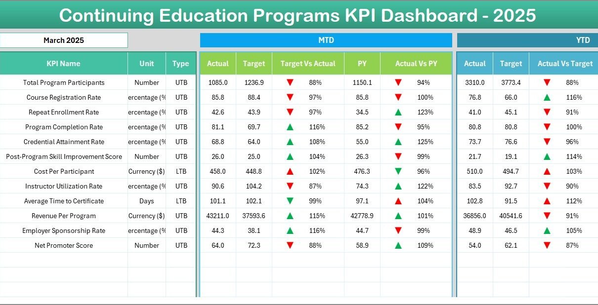 - Directional Trend Arrows – Up and down arrows indicate whether performance is improving or declining compared to targets and previous year values.