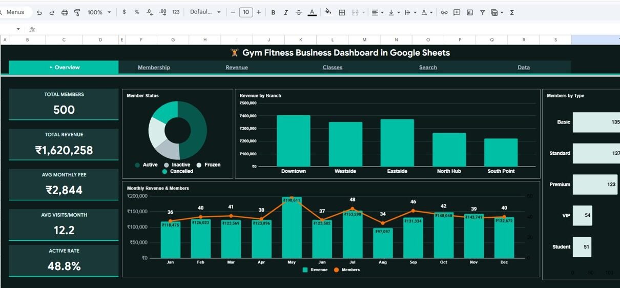 The Gym Fitness Business Dashboard in Google Sheets is a comprehensive, ready-to-use analytics template designed specifically for gym owners, fitness center managers, and personal training studios. This dashboard provides complete visibility into your gym’s performance through 6 interactive sheet tabs that cover everything from membership tracking and revenue analysis to class attendance, trainer performance, and individual member search. All charts and KPI cards update automatically when you enter your data, making it one of the most powerful Google Sheets fitness dashboards available for the fitness industry.Gym Fitness Business Dashboard in Google Sheets