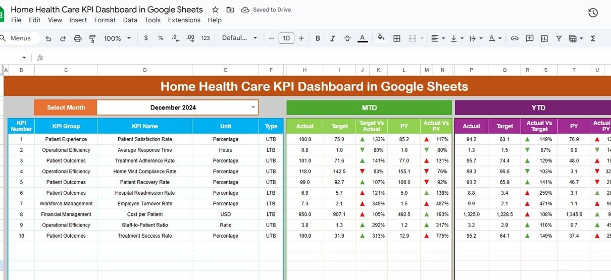Home health care agencies rely on timely data to evaluate patient care quality, staff efficiency, and operational performance. The Home Health Care KPI Dashboard in Google Sheets offers a ready-to-use, fully automated solution for tracking performance across clinical, operational, and financial KPIs.Home Health Care KPI Dashboard in Google Sheets