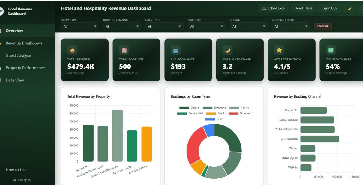 - 5 Interactive Dashboard Pages – Overview, Revenue Breakdown, Guest Analysis, Property Performance, and Data View give you complete visibility into your hotel operations.