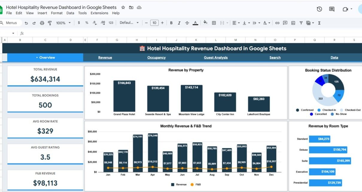 The Hotel Hospitality Revenue Dashboard in Google Sheets is one of the most complete options available. It tracks 5 key KPIs including Total Revenue, Total Bookings, Average Room Rate, Average Guest Rating, and F&B Revenue across 6 interactive tabs with charts, slicers, and a booking search page — all within Google Sheets.