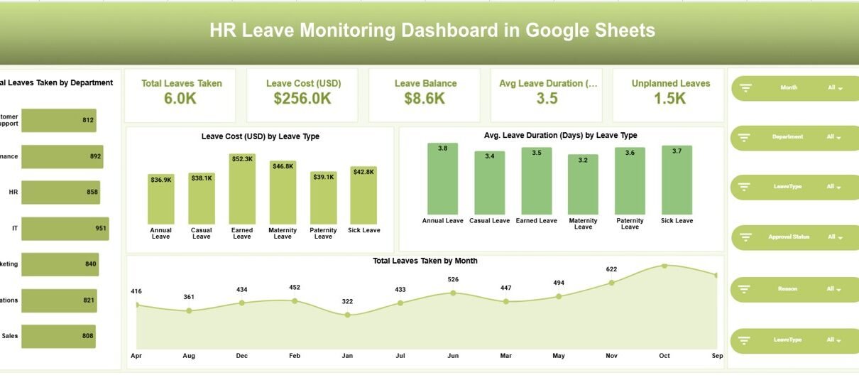 An HR Leave Monitoring Dashboard in Google Sheets is an interactive HR analytics solution designed to track employee leave trends, costs, and patterns using visual dashboards and structured data.