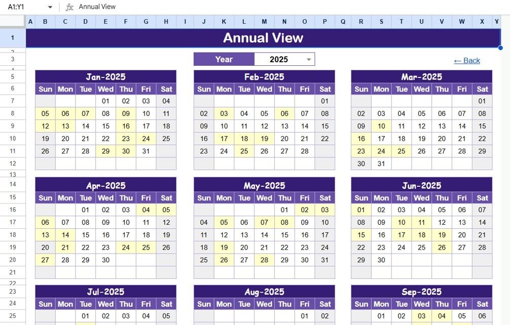 The Annual View sheet provides a 12-month visual calendar that lets you see all compliance activities throughout the year at a glance.