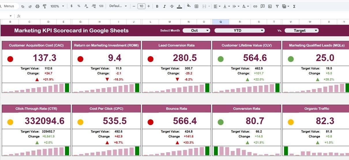 The Scorecard Sheet Tab is the main dashboard — a visual and interactive page that summarizes all marketing KPIs in one place.