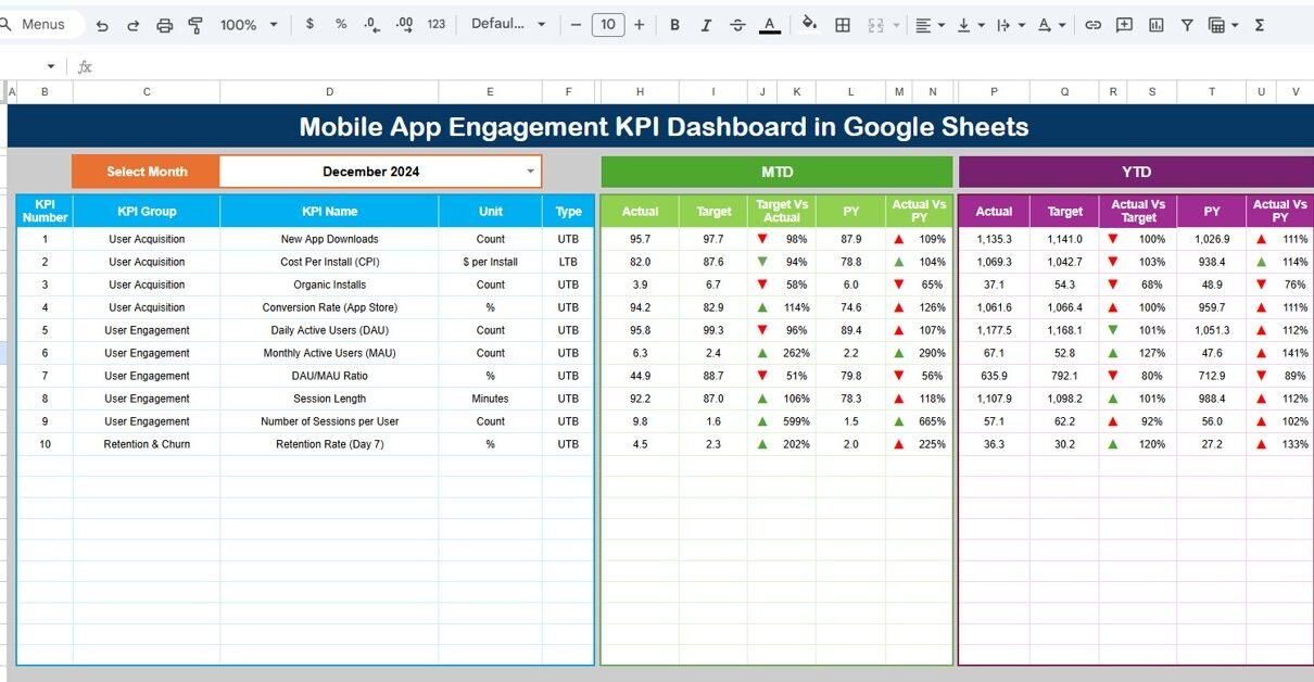 This ready-to-use dashboard centralizes all engagement KPIs in one structured Google Sheets file. It allows product managers, growth teams, marketers, and leadership to track performance using Month-to-Date (MTD), Year-to-Date (YTD), target comparisons, and trend analysis.