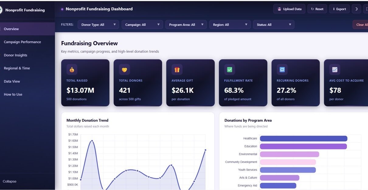 The Excel upload feature makes this dashboard reusable — upload a new data file each month, quarter, or year and instantly see updated analytics without rebuilding anything. The light and dark theme toggle, CSV export, and responsive design add professional polish that makes this suitable for board presentations and daily operational monitoring alike. For nonprofit teams who prefer spreadsheet-based analysis, the Nonprofit Fundraising Dashboard in Excel offers pivot tables and automated formulas within familiar Excel software.