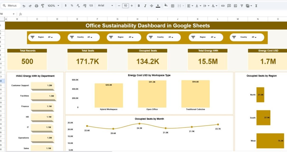 An Office Sustainability Dashboard in Google Sheets is a centralized reporting and analytics tool designed to monitor workplace sustainability metrics such as: