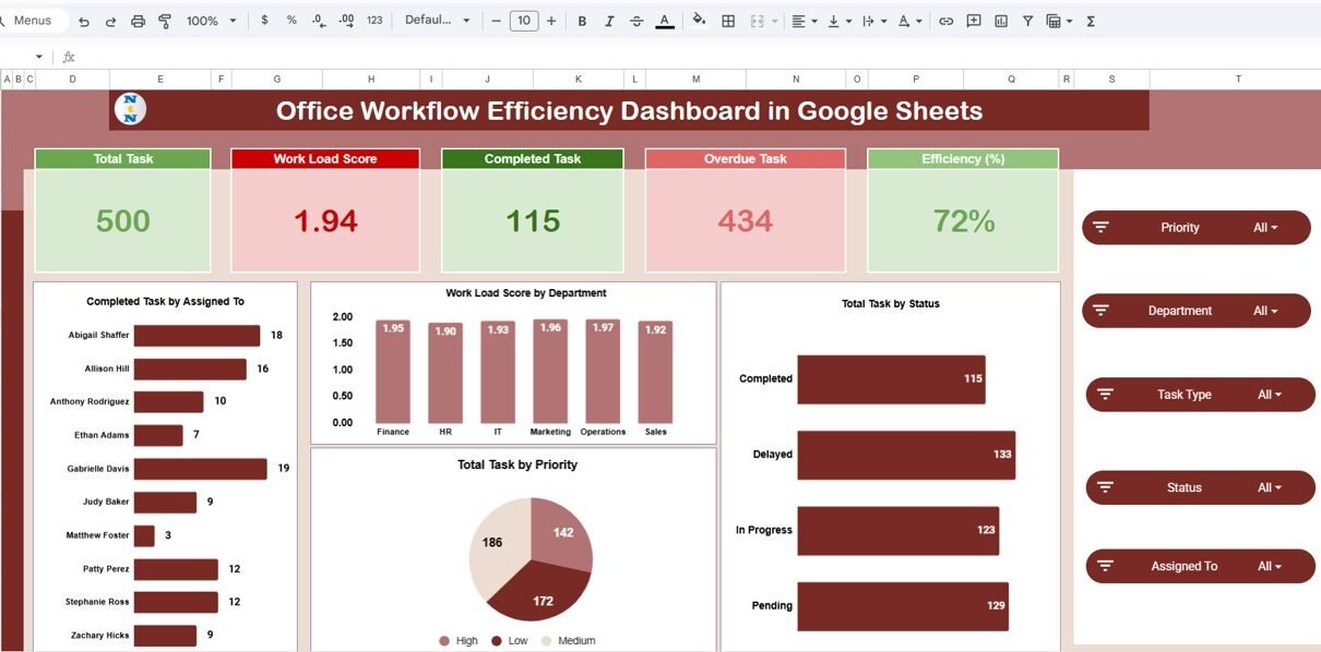 In this article, we will explain the structure, features, advantages, and best practices for using this powerful dashboard template.Office Workflow Efficiency Dashboard in Google Sheets
