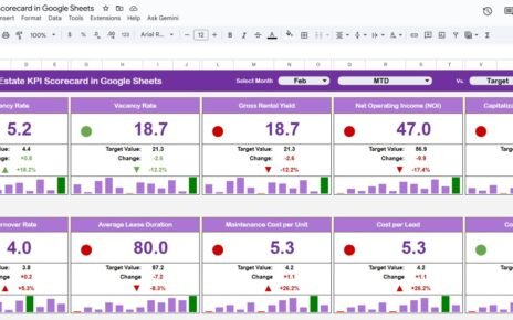 The Dashboard sheet serves as the main interface where users can see an overview of their KPIs. Key components of this sheet include: