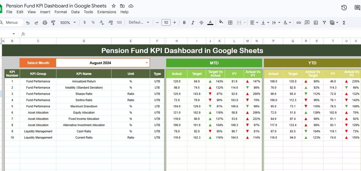 This ready-to-use Google Sheets template includes 6 worksheets designed specifically for pension fund KPI monitoring. The Dashboard sheet displays all KPI data for any selected month with MTD and YTD columns showing Actual, Target, and Previous Year values. Conditional formatting arrows (green up, red down) instantly show whether each KPI is meeting its target or falling behind.