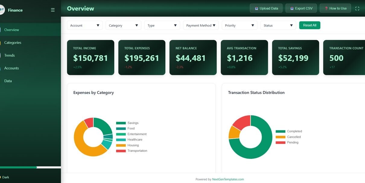 The Personal Finance Dashboard in HTML is packed with powerful features designed to make personal finance management effortless and insightful. This template includes 5 interactive dashboard pages that collectively track 6 key financial metrics: Total Income, Total Expenses, Net Balance, Avg Transaction, Total Savings, and Transaction Count.