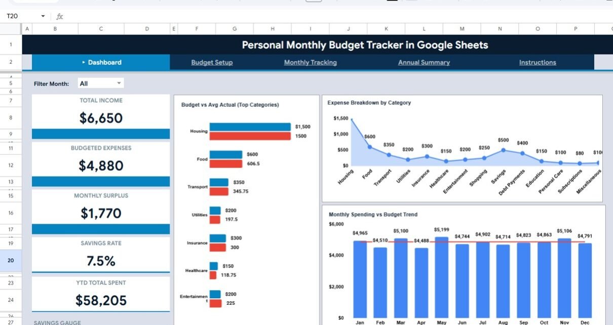 The Personal Monthly Budget Tracker in Google Sheets from NextGenTemplates is one of the best options available. It includes 4 professional pages with a visual Dashboard, Budget Setup, Monthly Tracking, and Annual Summary. The template features 6 KPI cards, 3 interactive charts, slicer filters, and fully automated formulas that update when you enter your data.