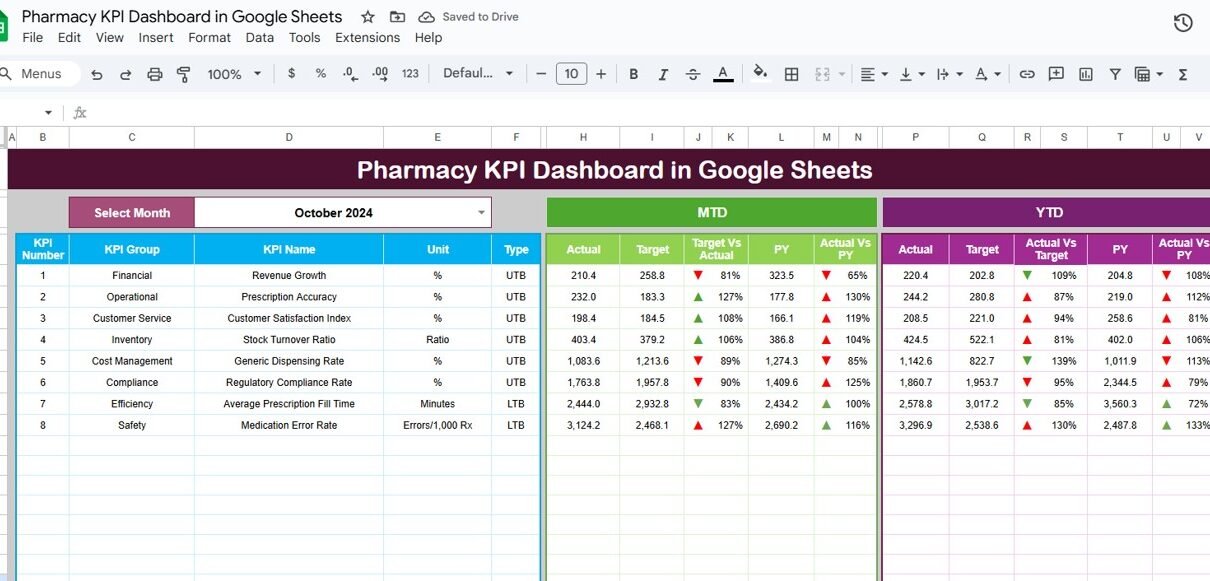 The Pharmacy KPI Dashboard in Google Sheets provides a powerful, easy-to-use solution for monitoring pharmacy operations. By tracking MTD and YTD performance, comparing against targets, and visualizing trends, managers can optimize workflows, improve service, and enhance profitability.