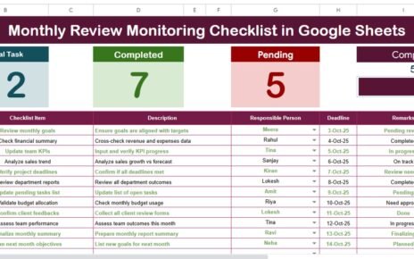 The Plumbing Maintenance Checklist in Google Sheets is a digital template designed to track and organize plumbing maintenance tasks. The template includes a user-friendly interface for capturing maintenance activities, assigning responsible persons, setting deadlines, and tracking progress.