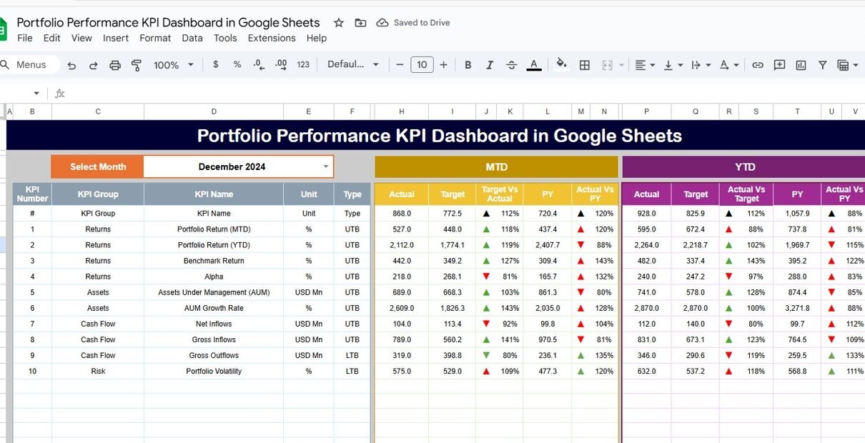 This ready-to-use dashboard helps track portfolio returns, risk metrics, diversification levels, and efficiency indicators on a monthly and yearly basis. Moreover, it provides instant comparison between actual performance, targets, and previous-year results. Since the dashboard runs in Google Sheets, it remains flexible, collaborative, and cost-effective.