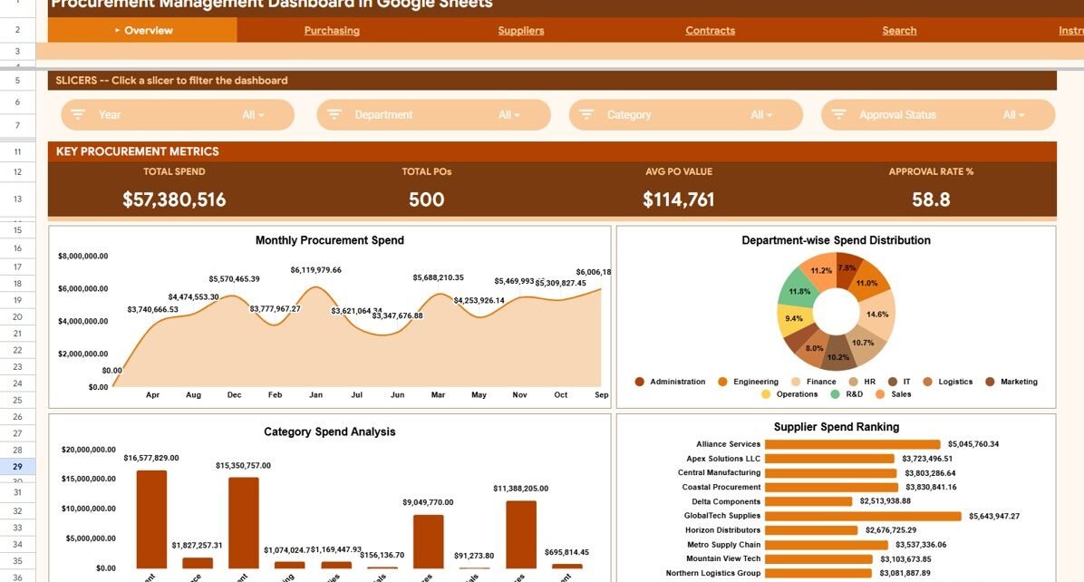 The Procurement Management Dashboard in Google Sheets delivers complete procurement visibility across 6 dedicated worksheets. The Overview page displays 4 KPI cards — Total Spend, Total POs, Avg PO Value, and Approval Rate % — alongside 4 charts covering monthly spend trends, department-wise distribution, category-level analysis, and supplier rankings. Multiple slicers let you filter the entire dashboard by department, supplier, category, or approval status in one click.